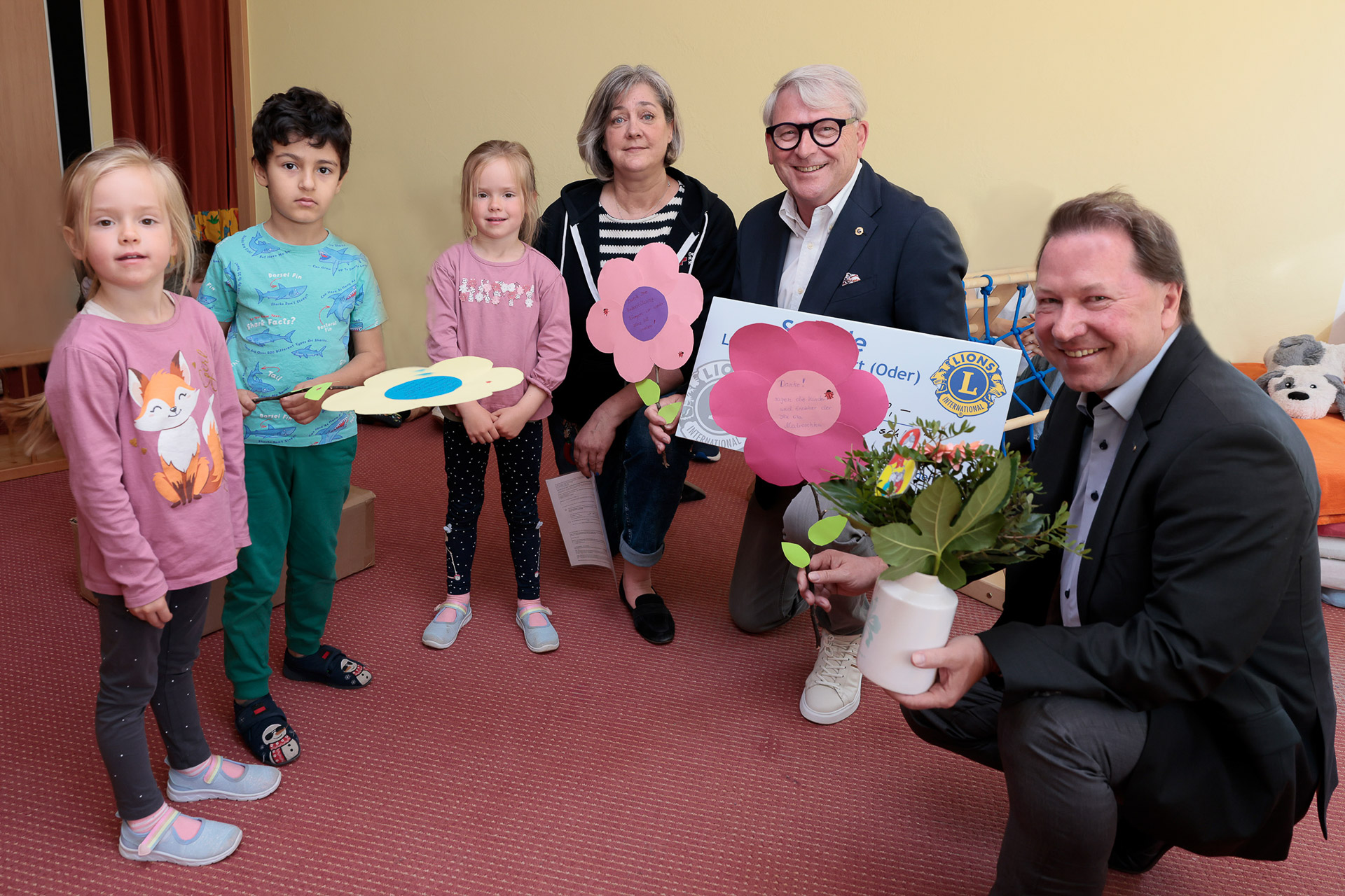 Bei der Übergabe dabei waren der Präsident des Clubs Ulrich Hammer und der Vize-Präsident Falk Schmidt, der übrigens vor rund 50 Jahren selbst in die Kita Matroschka ging.